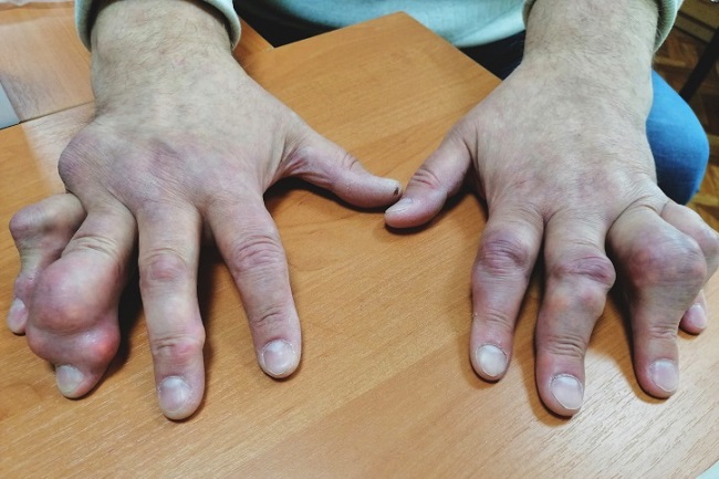 Для примера: на фотографии вы видите изменения пальцев рук у пациента с запущенной подагрой. При своевременном обращении к специалисту и раннем выявлении патологии можно предупредить осложнения.